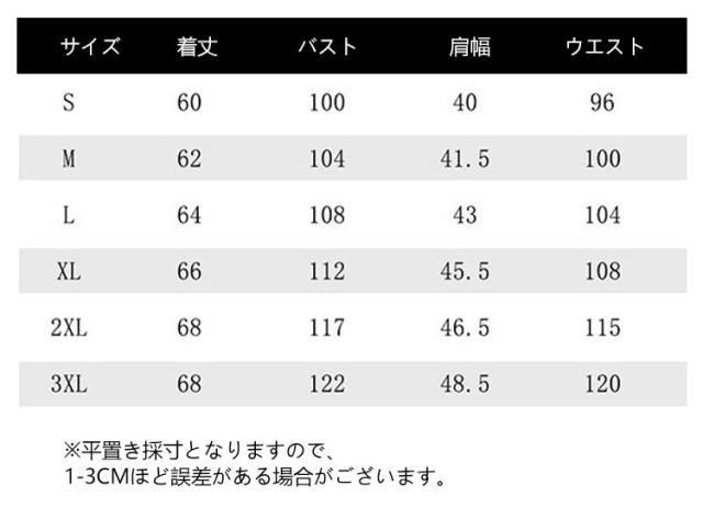 | サイズについての説明 | サイズ 着丈 バスト 肩幅 ウエスト ※平置き採寸となりますので、1-3cmほど誤差がある場合がございます。 |