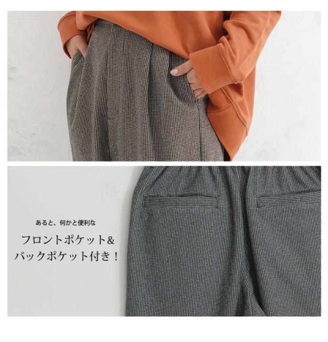 ウエストのタックを見せるテーパードパンツのスッキリ感