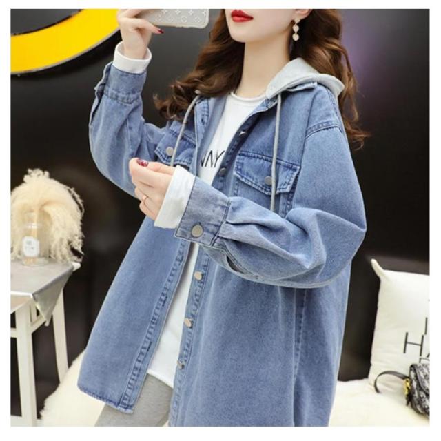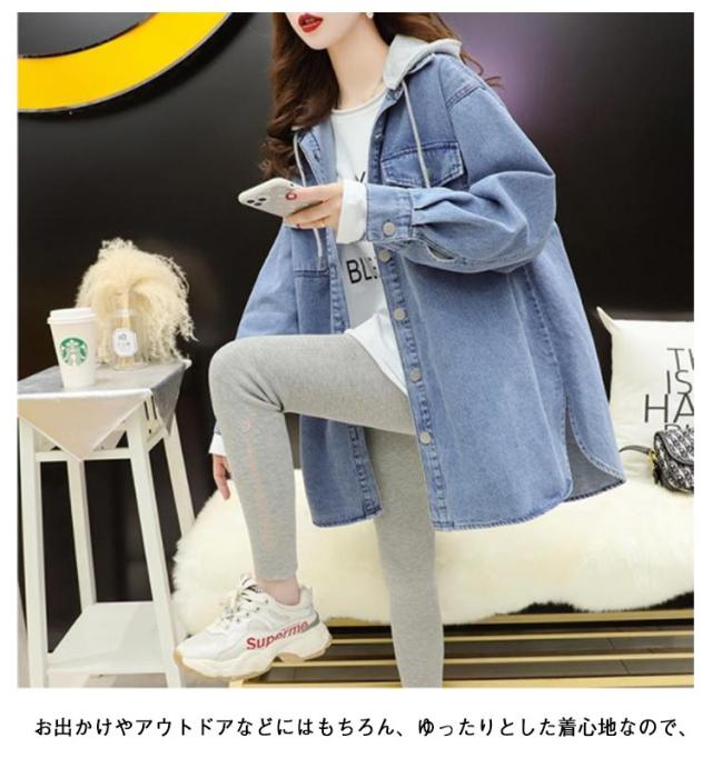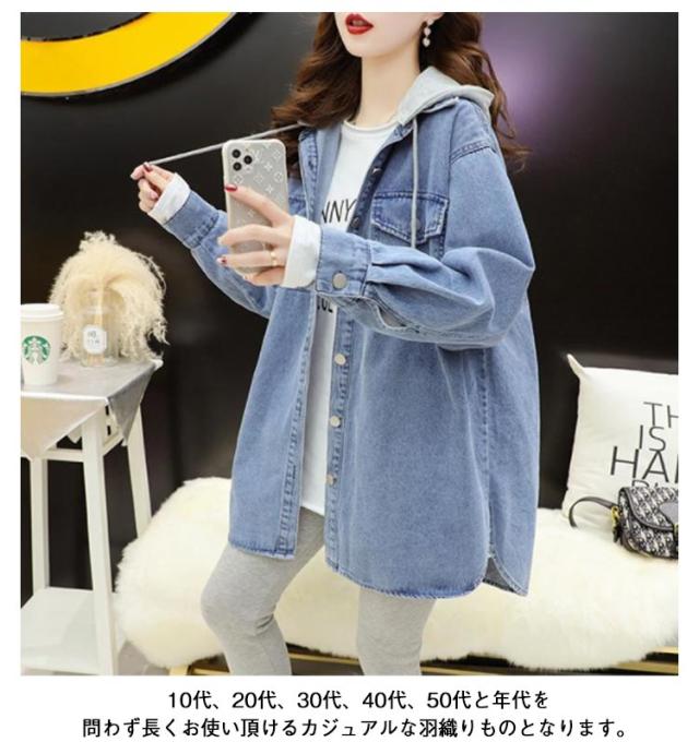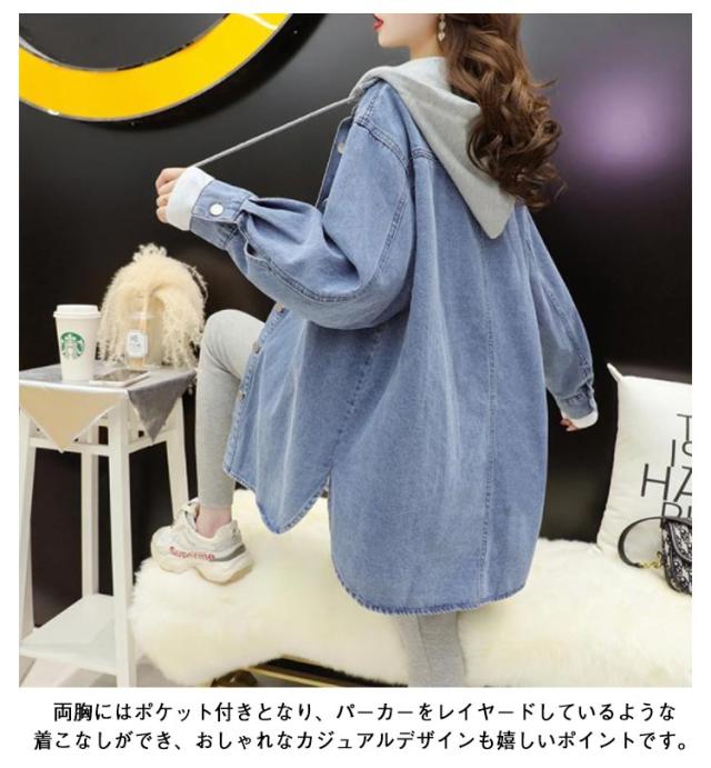 韓国ファッション デニム ロング 大人 体型カバー デニム ジャケット スリット入り シャツジャケット デニムジャケット デニムシャツ アウター 長袖 コート レイヤード アウター フード付き おしゃれ ゆったり 通勤 デニム S M L