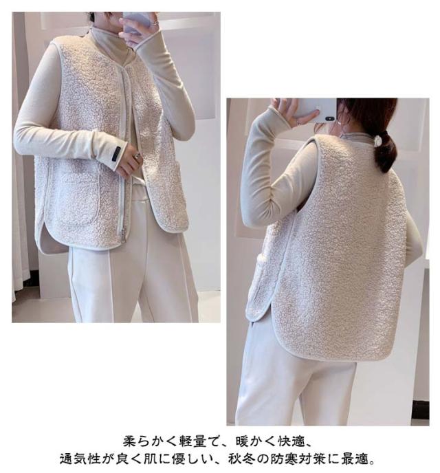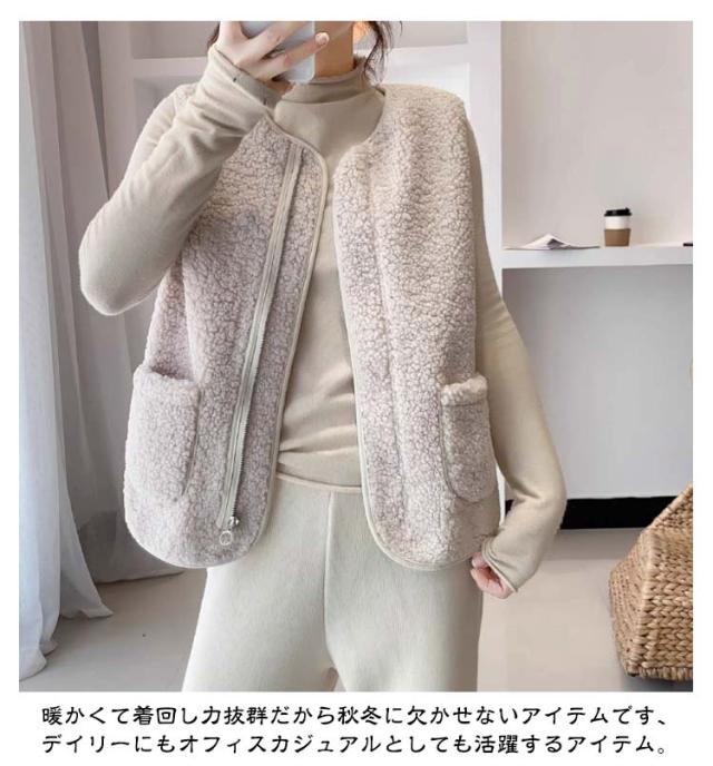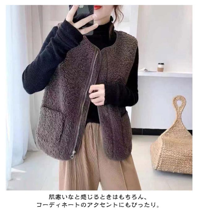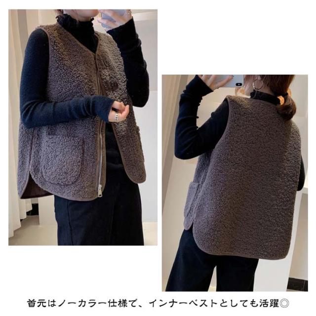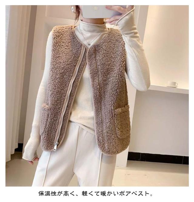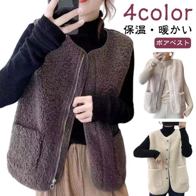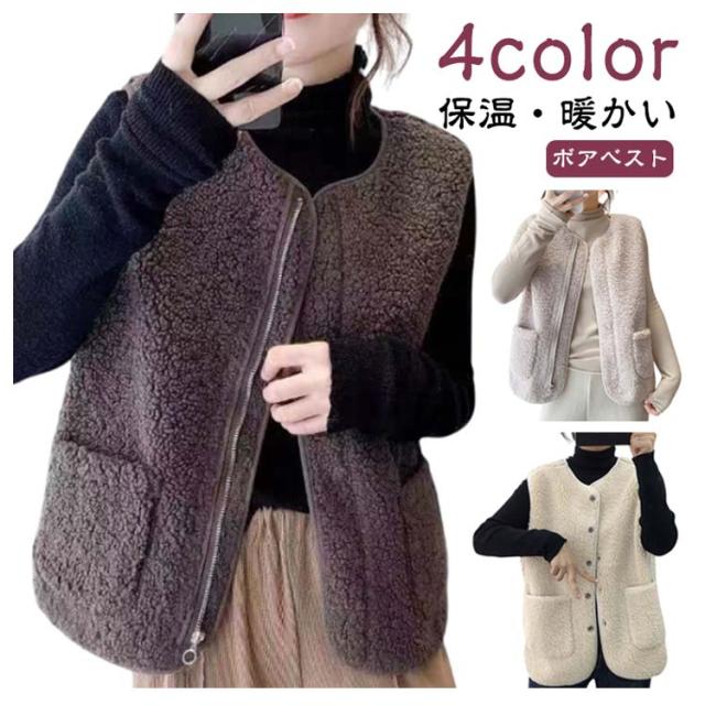 アウター レディース ボアベスト ボア 暖かい トップス ノーカラー ベスト ジャケット 羽織り 防寒 ジレ サイドポケット きれいめ 上品 春 秋冬 ジップアップ 秋 冬 ボア ベスト 前開き ボアベスト ボアフリース