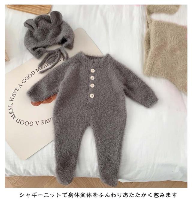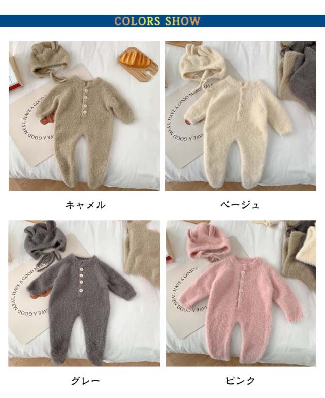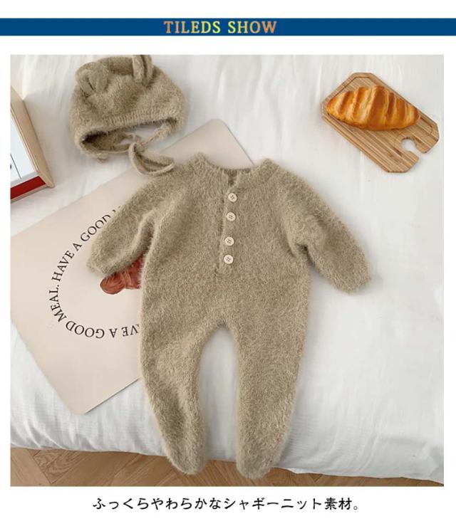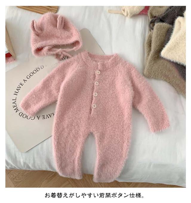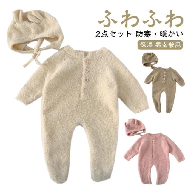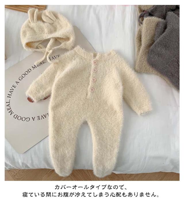 【2点セット】ベビー ロンパース ふわふわ ニット 帽子付き カバーオール キッズ ベビー服 ジャンプスーツ 女の子 男の子 着ぐるみ 可愛い 防寒 暖かい プレゼント あったか 長袖 秋冬 ルームウェア パジャマ 66 73 80 90cm つなぎ おしゃれ