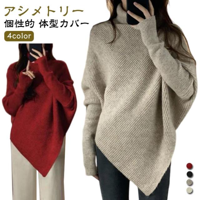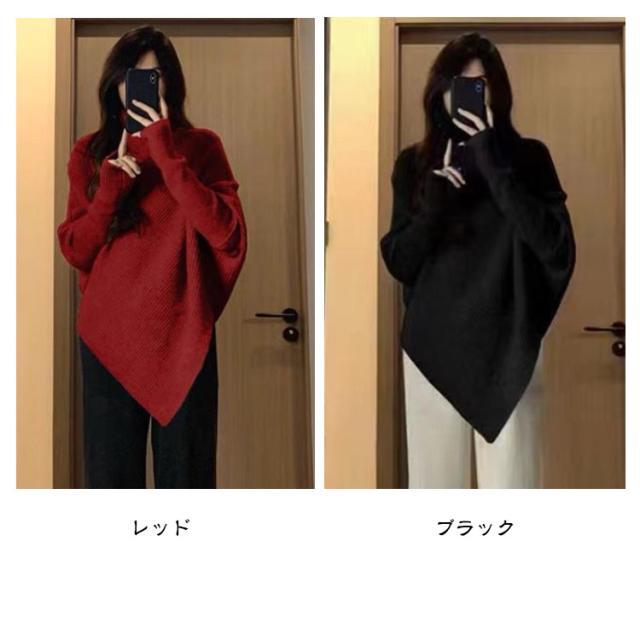 ニット アシメトリー 斜め タートルネック トップス 長袖 リブニット ブラック アイボリー レッド 赤 黒 細見え レディース 個性的 おしゃれ ゆったり 体型カバー ハイネック ニットトップス セーター 秋冬 カジュアル