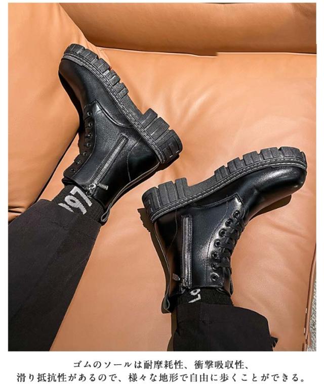 | メンズ厚底ブーツ ワークブーツ ゴムのソールは耐摩耗性、衝撃吸収性、滑り抵抗性があるので、様々な地形で自由に歩くことができる。 通勤や通学、普段履きとしてもカジュアルなコーディネートをお楽しみいただけます。 | |