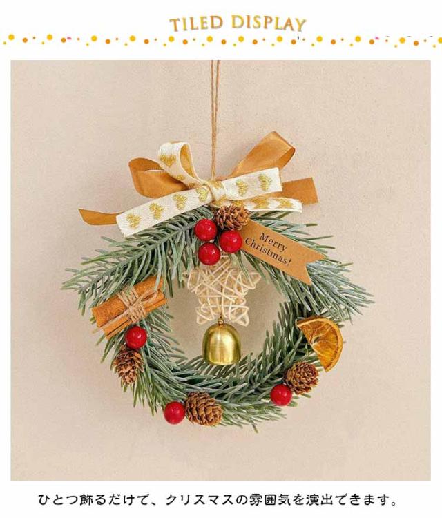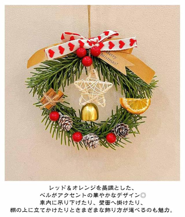 | かわいいミニクリスマスリース。【10cm】 レッド&オレンジを基調とした、ベルがアクセントの華やかなデザイン◎ 車内に吊り下げたり、壁面へ掛けたり、棚の上に立てかけたりとさまざまな飾り方が選べるのも魅力。 クリスマスらしい特別な雰囲気を演出してくれるので、パーティの飾りつけや、お部屋にシーズンムードを取り入れたい時にもおすすめですよ。 ひとつ飾るだけで、クリスマスの雰囲気を演出できます。 | |