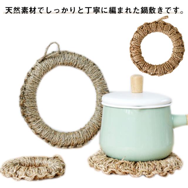 | 天然素材でしっかりと丁寧に編まれた鍋敷きです。 フックが付いているので、使わないときには壁にかけて収納。 見た目もシンプルでおしゃれです。 口が大きく開きますのでとっても使いやすいのです。 3サイズありますので、お鍋やケトルの大きさに合わせて揃えてみても。 和洋どちらにもなじんで、インテリアにもほどよくマッチします。 | |