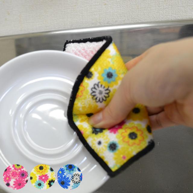 花柄がかわいい食器洗いスポンジです。表面は汚れをかき出すPETフィルムになっていて頑固なフライパンのコゲや茶渋もしっかり落とします。裏面は少量の洗剤でも泡立ち抜群のパイルメッシュになっています。