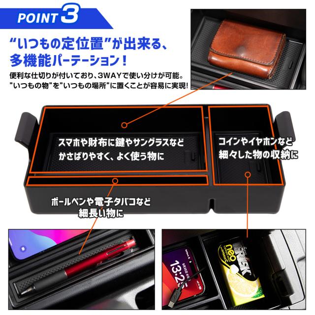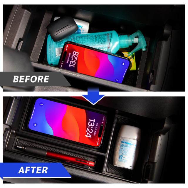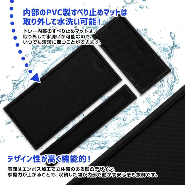 トヨタ 90系 ノア・ヴォクシーのコンソールボックスにピッタリなデザイン設計で、置くだけでスッキリ整理整頓できるコンソールボックストレーです! トヨタ 90系 ノア・ヴォクシーの純正コンソールボックスは深くて仕切りもないため中の物が探しづらく、走行中に中身がバラバラ、充電ケーブルが絡まりさらにストレス…なんていう事が。 そこで、スペースに合わせて快適スッキリ収納できる、トヨタ 90系 ノア・ヴォクシー専用設計コンソールボックストレー! コンソールボックスにピッタリ収まる専用設計でフィット感は抜群! 走行中にカタカタと音がしないので、ストレスなくご使用いただけます。 トレーの深さは、収納しやすく中身を把握しやすい、使い勝手の良い4cmに設計。 純正コンソールボックスは深さが15cm以上あるので、上下に収納する事も可能に。 トレーを置いた後は、下段を目隠し収納として有効活用する事もできます。 また、トレーには充電ケーブルを通す専用穴を設けているので、配線のごちゃつきもスッキリ解決! 配線はトレーの下に隠れるため、見た目もスッキリ整理整頓された印象に。 トレーには、スマホやタバコ、鍵などのかさばりやすくよく使う物を置くスペース、 ボールペンや電子タバコなど長細い物を置くスペース、 細々としたものを置けるスペースの3箇所に仕切られており、"いつもの定位置"が出来上がります。 トレー本体はABS樹脂製のクールな艶消しブラックで車内にさりげない高級感をプラス。 トレー内部の滑り止めマットは水洗いが可能なので、いつでも清潔にしておくことができます。 |