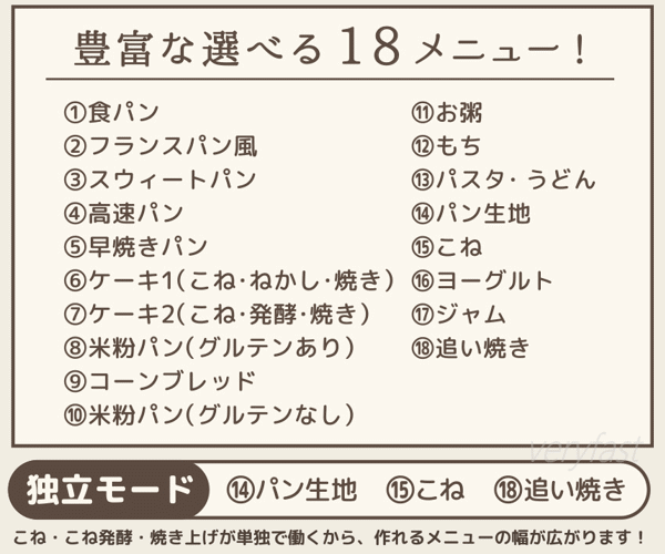 お家で簡単、ふかふか焼き立てパン♪材料を入れてメニューを選べば後はおまかせ。基本の食パンからケーキ、ジャム、お餅までこれ一台で作れます。材料を入れてメニューを選ぶだけのかんたん操作。小さめサイズの0.8斤から1.0斤のサイズが選べます。豊富な選べる18メニュー。こね・こね発酵・焼き上げが単独で働くから作れるメニューの幅が広がります。好みに合わせて3種類の焼き加減に調節できます。■本体サイズ約幅225×奥行310×高240mm■本体重量約3kg■電源AC100V 50/60Hz■消費電力500W■タイマー:15時間まで(焼き上がり時間を含む)■小麦粉容量:約200g(0.8斤)、約250g(1.0斤)■コード長約1.2m■温度過昇防止装置:温度ヒューズ(184℃)■セット内容:本体、パンケース、羽根、計量カップ、計量スプーン、羽根取り棒、レシピ付き取扱説明書(保証書)■カラー:ベージュ■生産国:中国※本製品は一般家庭用です。業務用等にご使用にならないで下さい。フタにふきんをかけないで下さい。食物アレルギーをお持ちの方は医師と相談の上、使用して下さい。