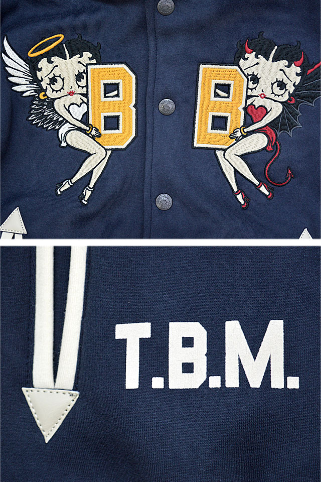 1920年代〜40年代にアメリカでワークウェアを中心とした製品を世に送り出したブランド「The BRAVE-MAN」から「BR×BETTYコラボ 天使と悪魔ベティ ボンディングスタジャン(BBB-2460)」のご紹介です。 大きな瞳とぽってりした赤い唇が印象的な女の子、ベティ・ブープ(Betty Boop)。 ボディーに弾力のある肉厚なボンディング生地を採用したスタジャンです。 フロントはスナップボタン仕様。 背中と両胸、右袖の絵柄には刺繍を、ポケット縁と袖のロゴにはプリントを用いてデザインしました。 カジュアルに着こなしに取り入れることの出来る、大人のキャラクターアイテムです。 | |||||||||||||||||||||||||