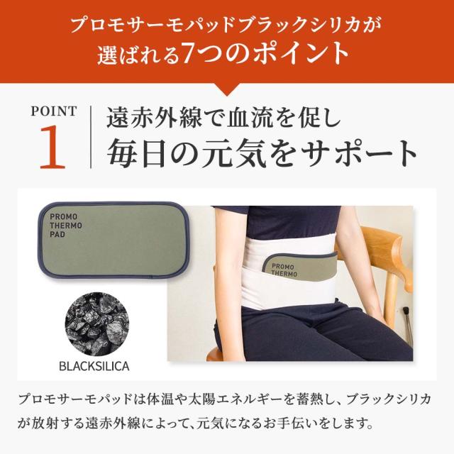 プロモサーモパッドは体温や太陽エネルギーを蓄熱し、ブラックシリカが放射する遠赤外線によって、元気になるお手伝いをします。