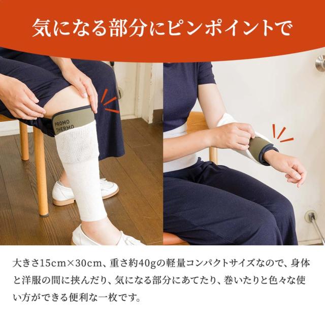 プロモサーモマットの効果そのままに、衣服に挟んだり、お手持ちのベルトなどで固定したりと、気になる部分に使っていただけるようコンパクトに仕上げたパッドです。