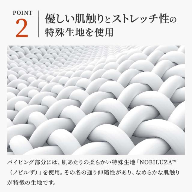 パイピング部分には、肌あたりの柔らかい特殊生地「NOBILUZA™(ノビルザ)」を使用。その名の通り伸縮性があり、なめらかな肌触りが特徴の生地です。