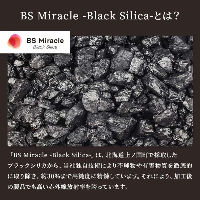 「BS Miracle Black Silica」は、北海道上ノ国町で採取したブラックシリカから、当社独自技術により不純物や有害物質を徹底的に取り除き、約30%まで高純度に精錬しています。それにより、加工後の製品でも高い赤外線放射率を誇っています。
