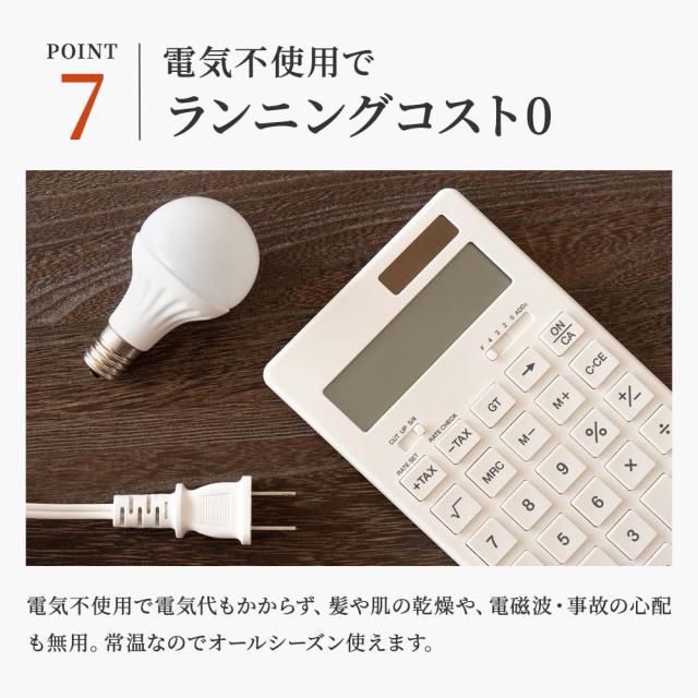 電気不使用で電気代もかからず、髪や肌の乾燥や、電磁波・事故の心配も無用。常温なのでオールシーズン使えます。