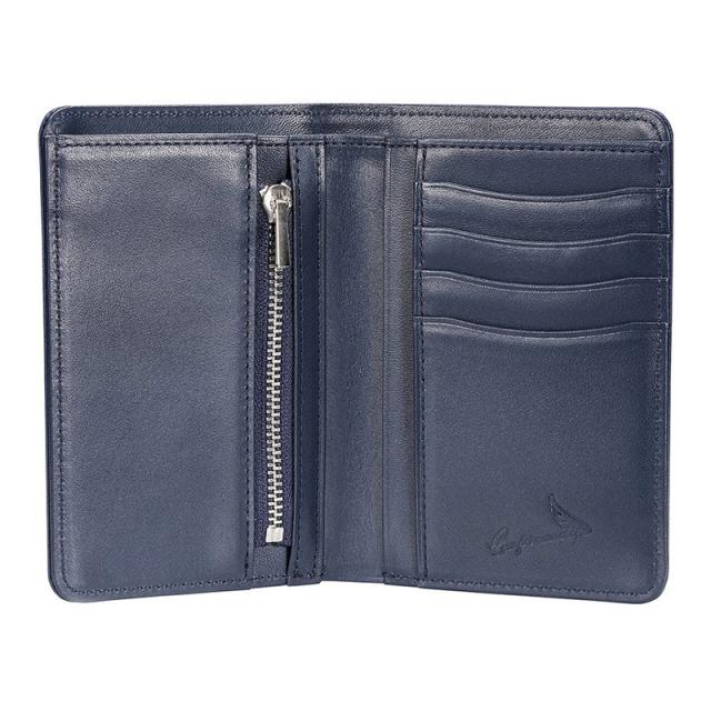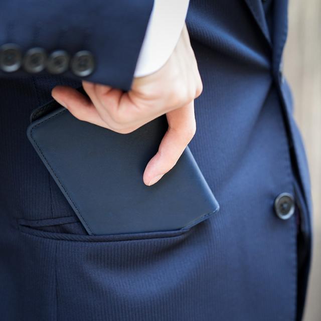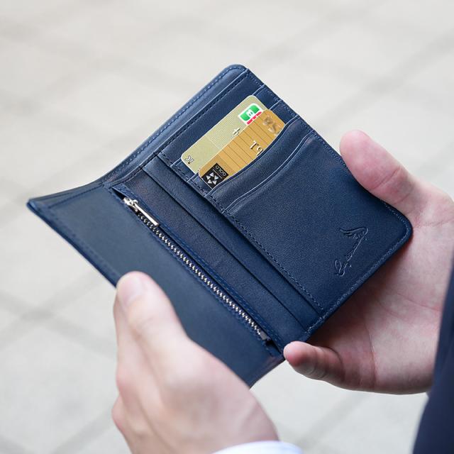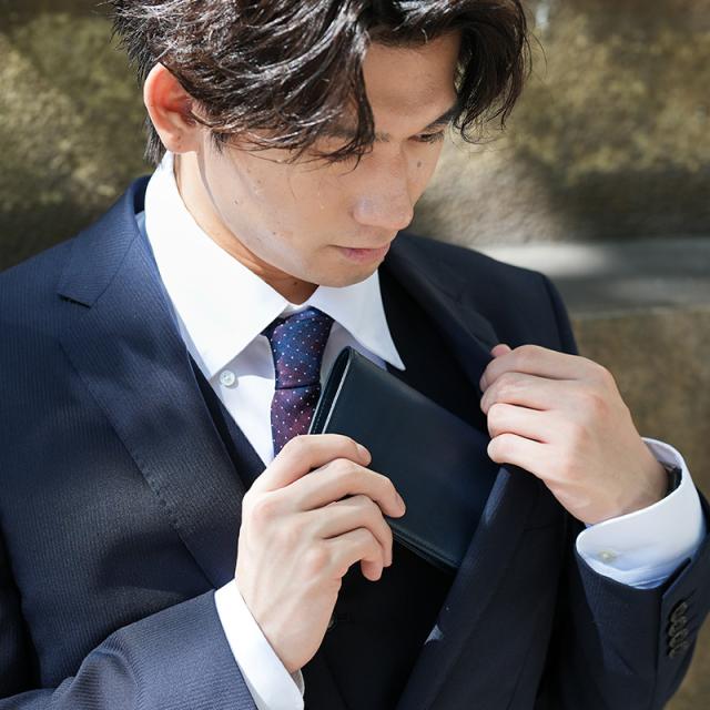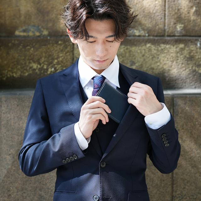 キャッシュレス時代を意識したコンパクトサイズの財布は、ジャケットの内ポケットに収まりがよく、シルエットを崩しません。