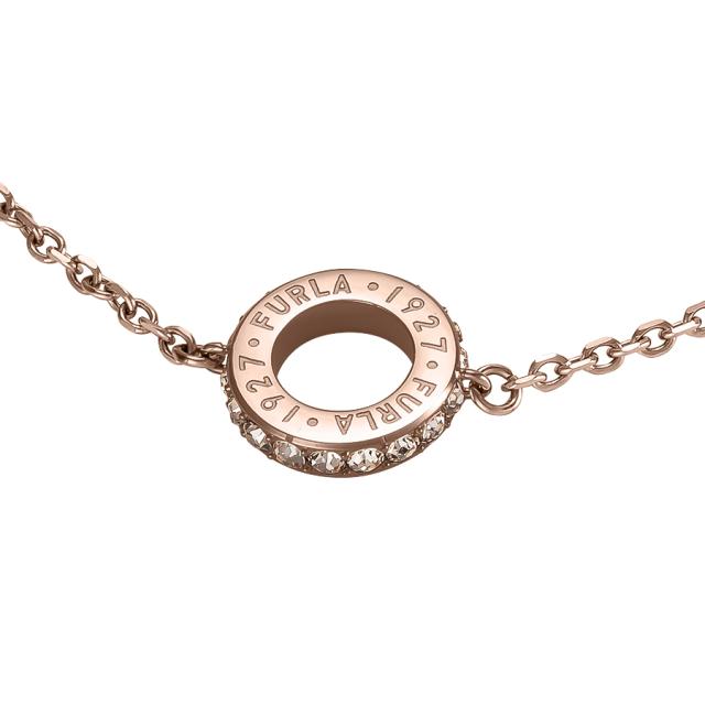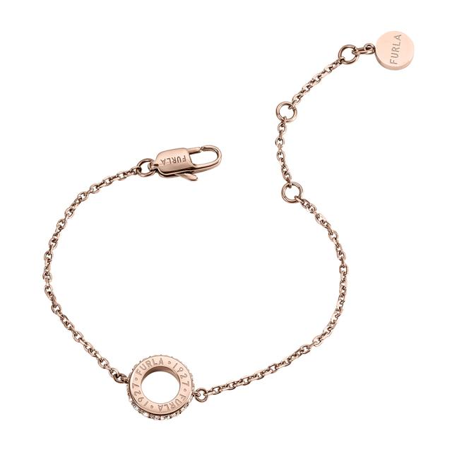 腕時計のベゼルにはクリスタルが配された特別仕様となっており、ローズゴールドのブレスレットには「FURLA 1927」と記載され、側面にはクリスタルが散りばめられています。