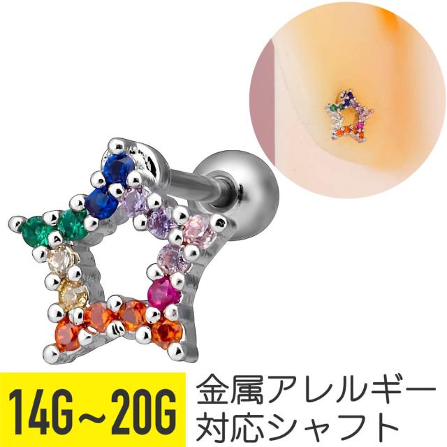 レインボー カラフル ジュエル スター ストレートバーベル 14G 16G 18G 20G サージカルステンレス ヘリックス 軟骨ピアス ボディピアス