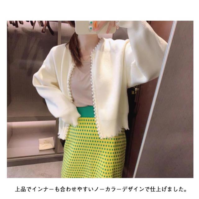 | エレガントな雰囲気になるカーディガン 襟から前立てに大きめパールが印象的なカーディガン。 上品でインナーも合わせやすいノーカラーデザインで仕上げました。 いつものコーデに羽織るだけでトレンド感と華やかさをプラスしてくれます。 | |
