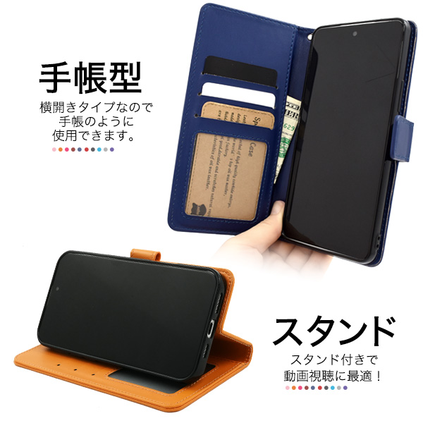 衝撃やキズなどから守ります。 また、内部はソフトケースなので着脱が簡単です。 背面を折り返すとスタンドとして使用できるので、動画視聴に便利です。 落下防止に最適なストラップとストラップホール付きです。 横開きタイプなので、手帳のように使うことができます。 また、内側に3つのカードポケットとサイドポケットが付いています。 | ||||||||||||||