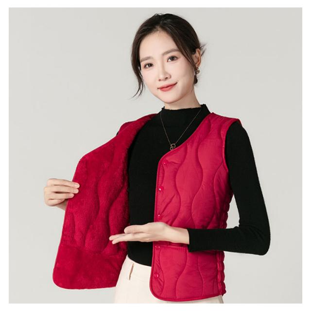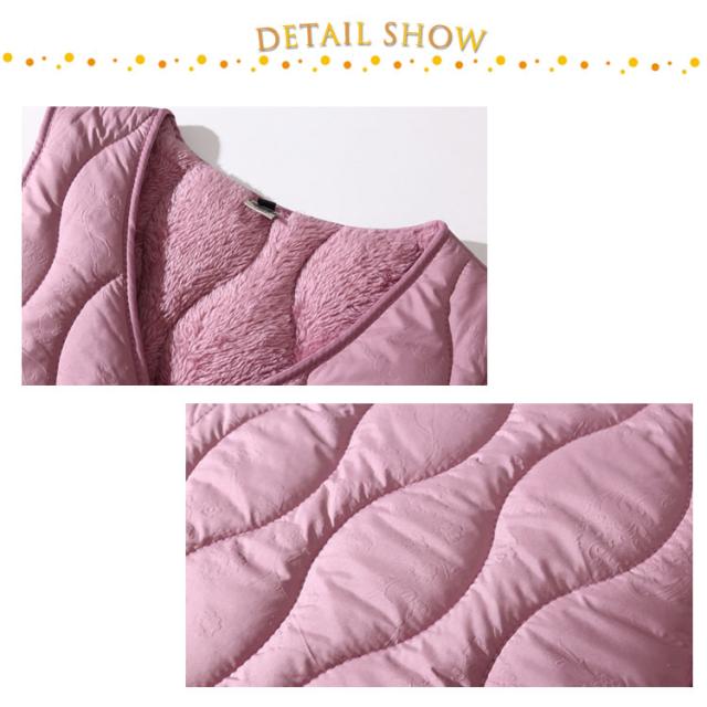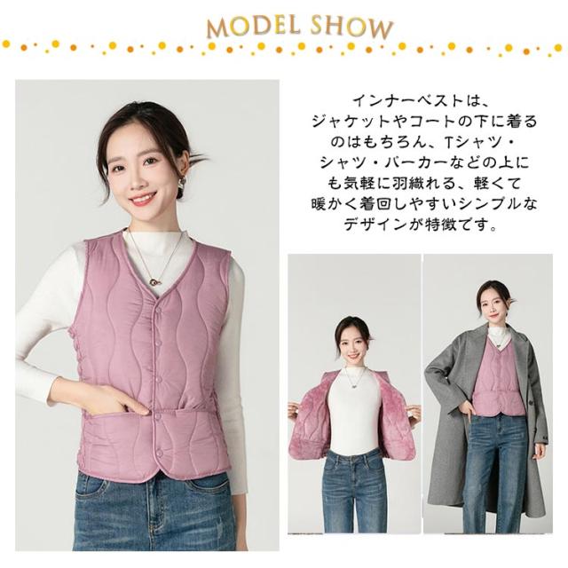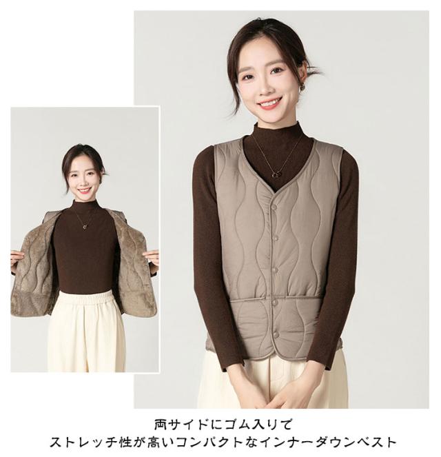 | 両サイドにゴム入りでストレッチ性が高いコンパクトなインナーダウンベスト。【裏起毛で二重防寒】【M−5XL】 インナーベストは、ジャケットやコートの下に着るのはもちろん、Tシャツ・シャツ・パーカーなどの上にも気軽に羽織れる、軽くて暖かく着回しやすいシンプルなデザインが特徴です。 Vネックの首元はシャープでスッキリとした印象を与えてくれます。 ウエスト部分を少しシェイプすることで女性らしいシルエットになっています。 裏面はふんわりとした肌触りの暖かな裏起毛生地を使用。 コンパクトながら両サイドにゴム入りでストレッチ性が高い。 | |