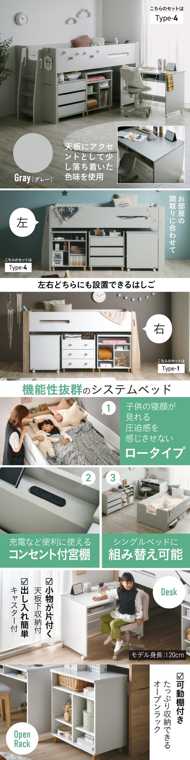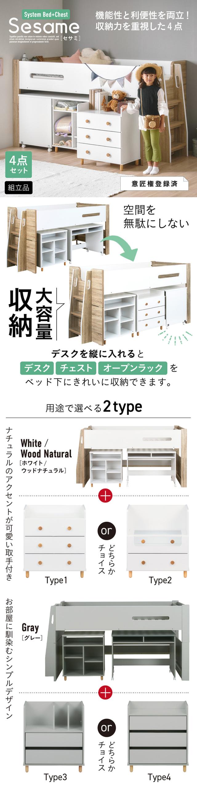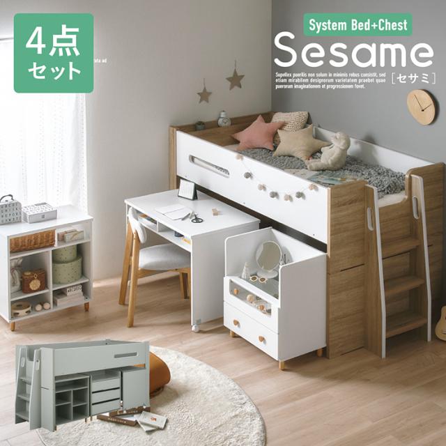 システムベッド ロフトベッド シングルベッド 子供 ロータイプ 階段 木製 スノコ 学習机 オープンラック チェスト おしゃれ ナチュラル コンパクト 北欧 組み替え可能 Sesame(セサミ) 4点セット 2色対応