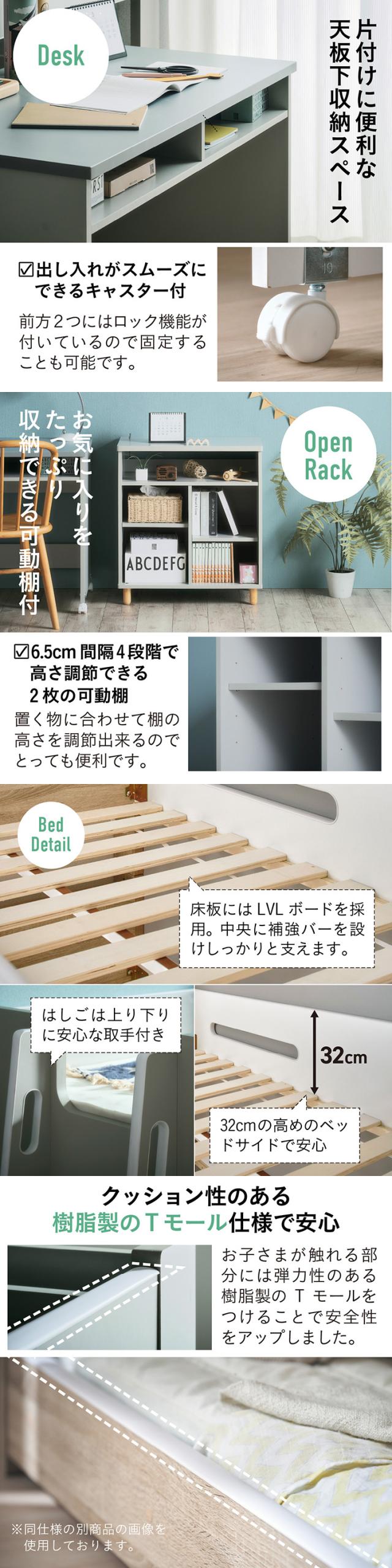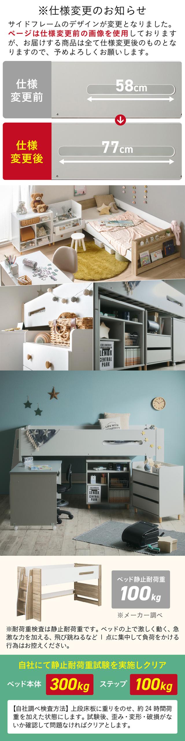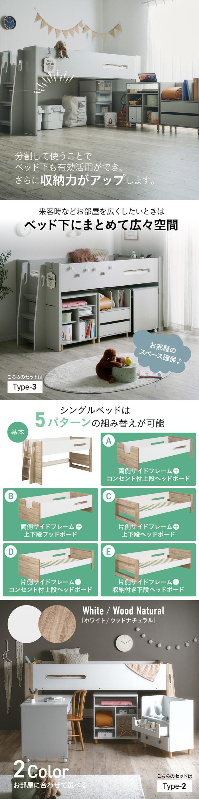 システムベッド ロフトベッド シングルベッド 子供 ロータイプ 階段 木製 スノコ 学習机 オープンラック チェスト おしゃれ ナチュラル コンパクト 北欧 組み替え可能 Sesame(セサミ) 4点セット 2色対応