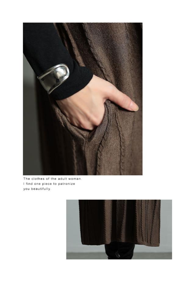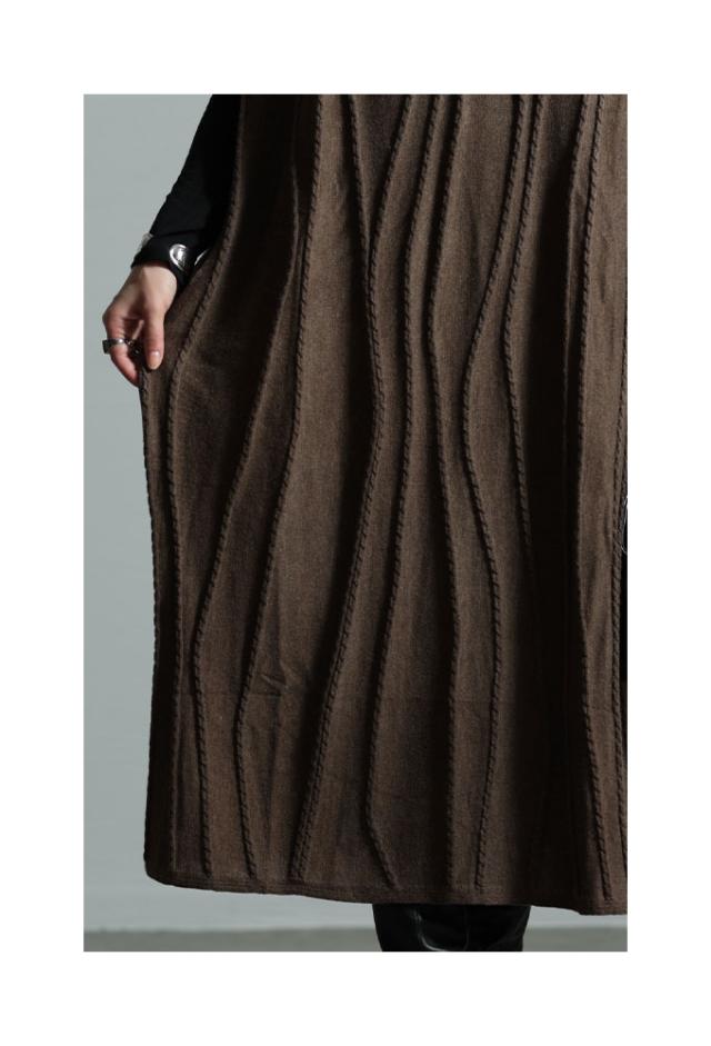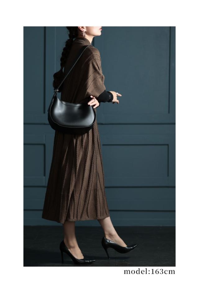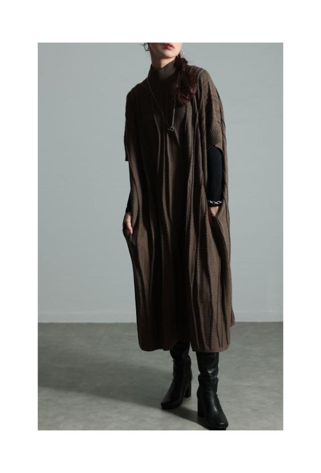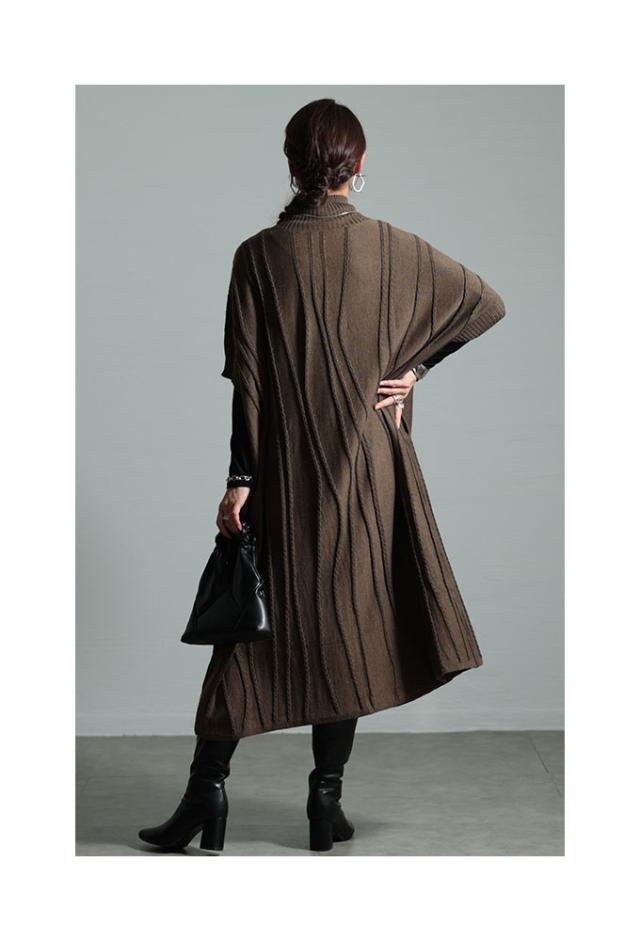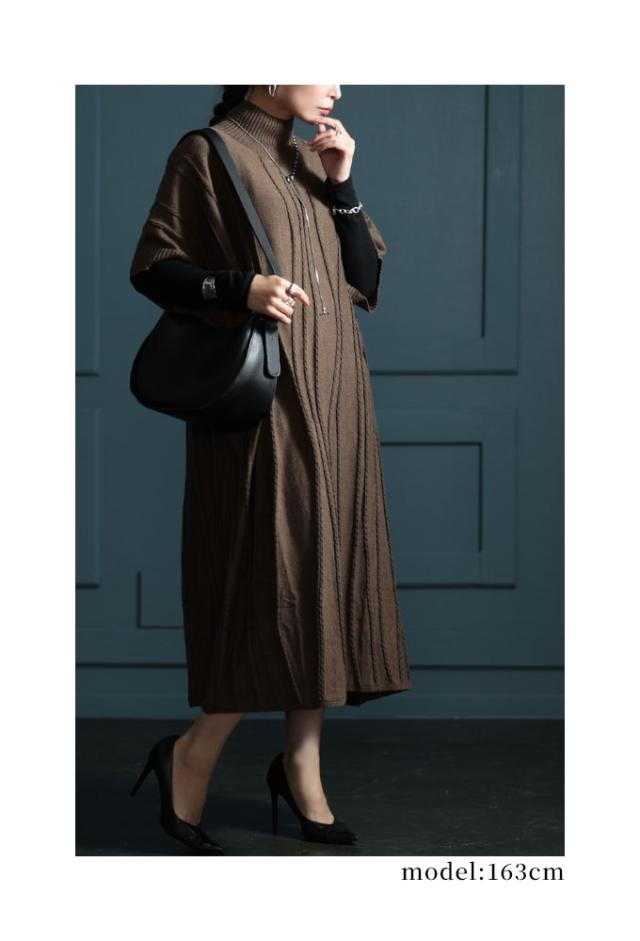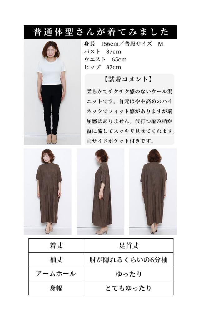 着丈は足首丈、袖は肘が隠れるくらいの6分袖です。柔らかでチクチク感のないウール混ニットワンピースです。腕を水平に広げると長方形シルエットになり、とてもゆったりしていました。袖口も腕が2本通るくらいのゆとりがあります。首元はやや高めのハイネックでフィット感がありますが窮屈感はありませんでした。ゆらゆら波打つような編み柄が、視線を縦に流してスッキリ見せてくれます。両サイドポケット付きです。