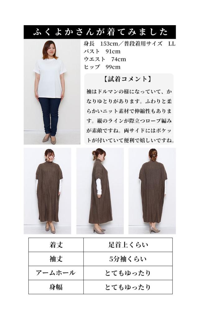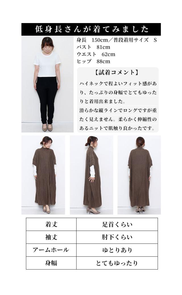 着丈は足首くらいです。首元はハイネックで程よいフィット感がありました。袖は肘下くらいです。袖口は余裕がありました。たっぷりの身幅でとてもゆったりと着用出来ました。滑らかな縦ラインでロングですが重たく見えません。柔らかく伸縮性のあるニットで肌触り良かったです。
