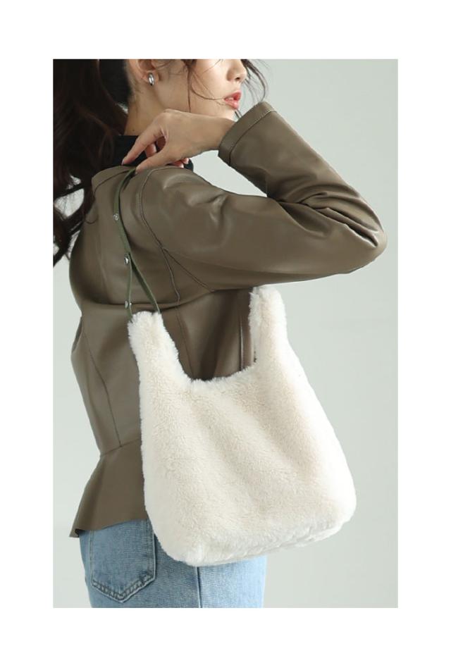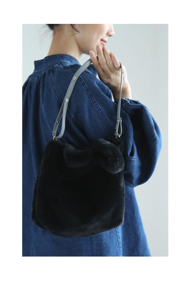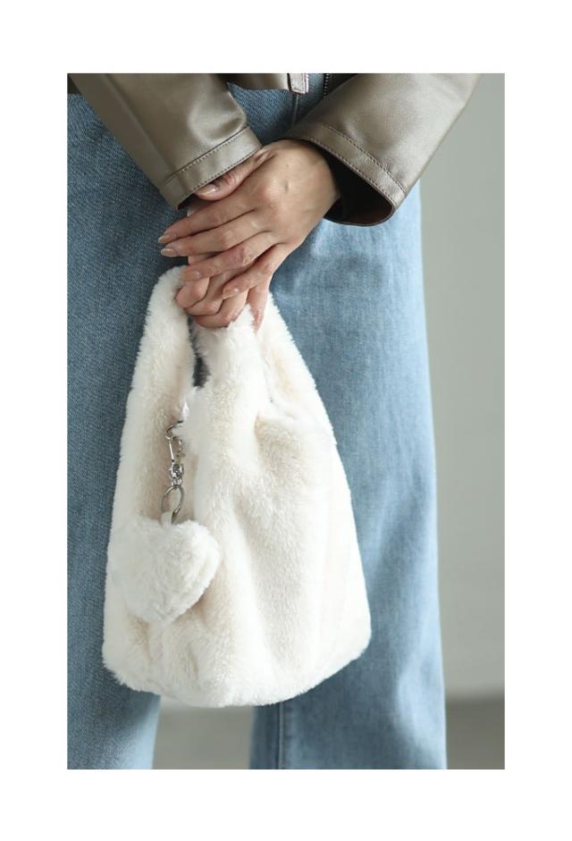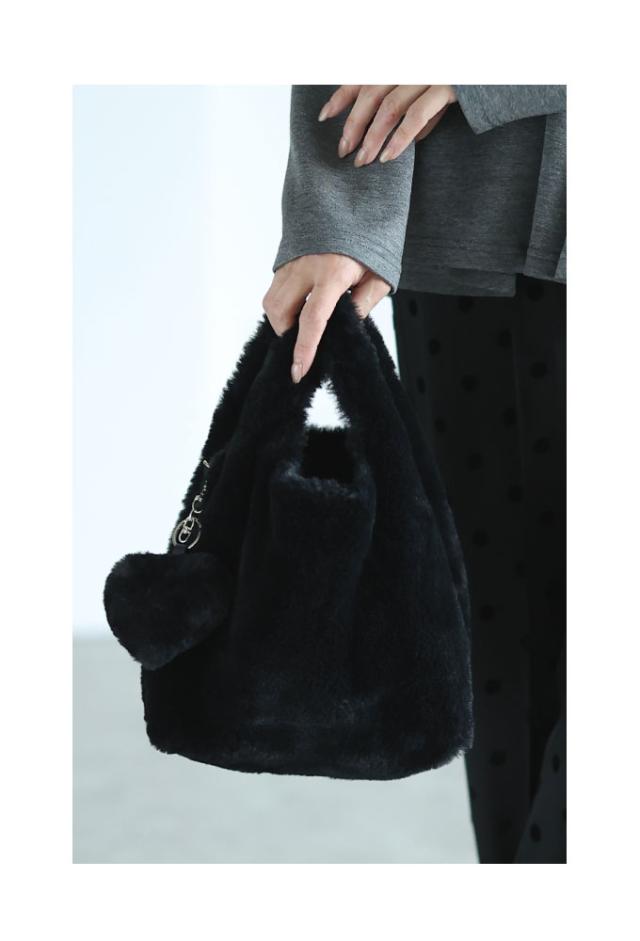 ふわふわのファーが可愛いミニバッグです。ストラップが2種類付属していて、持ち方を手持ち、肩掛け、斜めがけなど、お好みで変えられるマルチウェイ仕様です。バッグのスペースにはまちがあり、底板もあります。内側にファスナーポケットが1つ付いていて、上側はマグネットボタンで閉じられます。同じ素材のハート型チャームも付いていてとても可愛いです。