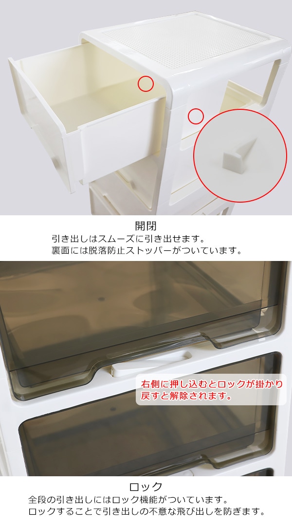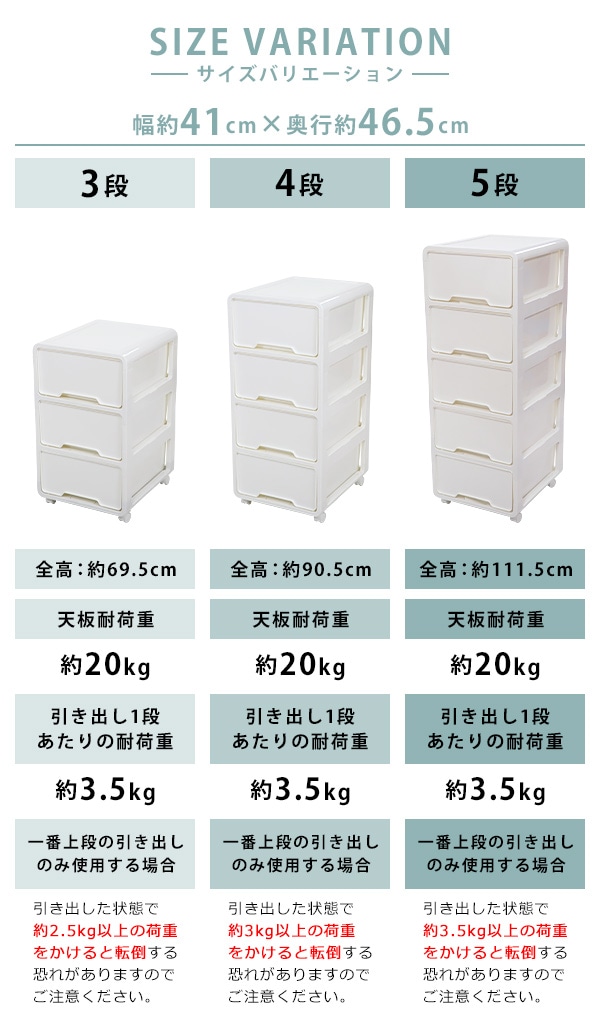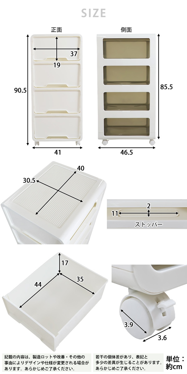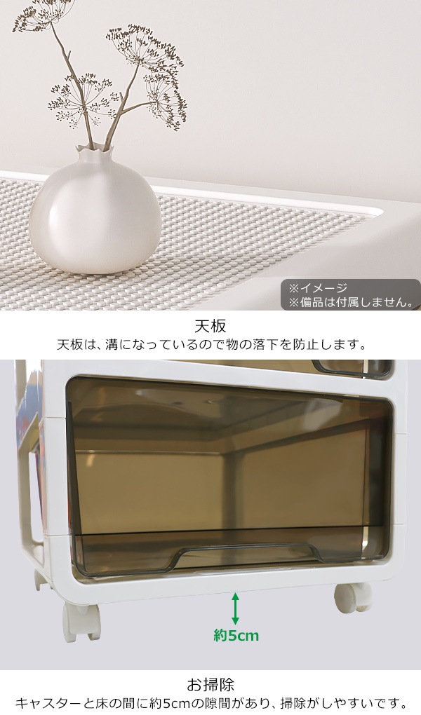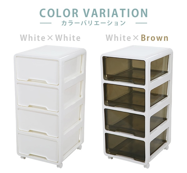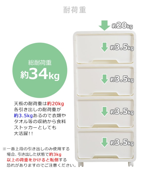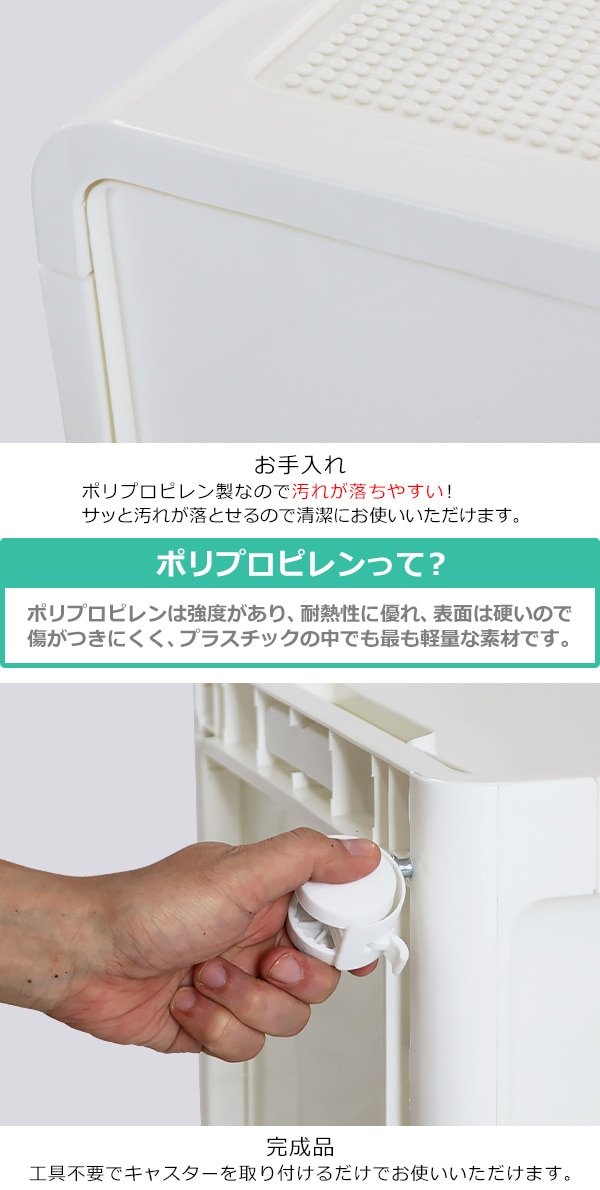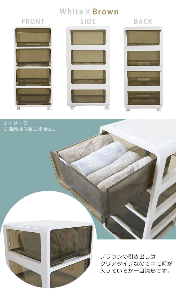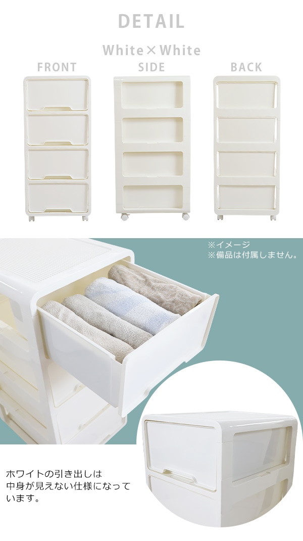 ポリプロピレン製の4段チェストです。 押し入れやクローゼット、リビングや寝室まで様々なシーンで使えます。 ホワイト×ホワイトは中に何が入っているか透けて見えない仕様になっています。 ホワイト×ブラウンは引き出しがクリアタイプなので中に何が入っているか一目瞭然です。 天板は溝になっているので物の落下を防止し、凹凸があるのでブロック等をはめることができます。 約5.2kgと軽量設計かつキャスターがついているので移動が楽に行えます。 全ての引き出しに脱落防止ストッパーが付いています。 脚と床の間に約5cmの隙間があるのでお掃除もしやすいです。 工具不要でキャスターを取り付けるだけですぐにお使いいただけます。 ※こちらの商品は、キャスターを取り付けるだけの完成品です。 ■本体重量:約5.2kg ■耐荷重:天板/約20kg、引き出し/各約3.5kg ■材質:ポリプロピレン ●新品商品ではありますが、輸入商品の為、多少の擦り傷などがある場合がございますので、ご納得の上ご購入下さいませ。 ●ご購入後、お客様ご都合によるご返品、ご返金等は一切お受け致しておりません。 ●本商品を使用した際に発生したトラブル、事故につきまして、当社は一切の責任を負いません。ご使用に関しましては、全て自己責任にてお願い致します。 |
