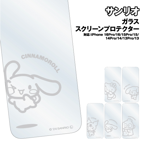 送料無料 サンリオキャラクターズ iPhone16Pro/16/15/15Pro/14/14Pro/13/13Pro対応ガラススクリーンプロテクター SANG-479-80