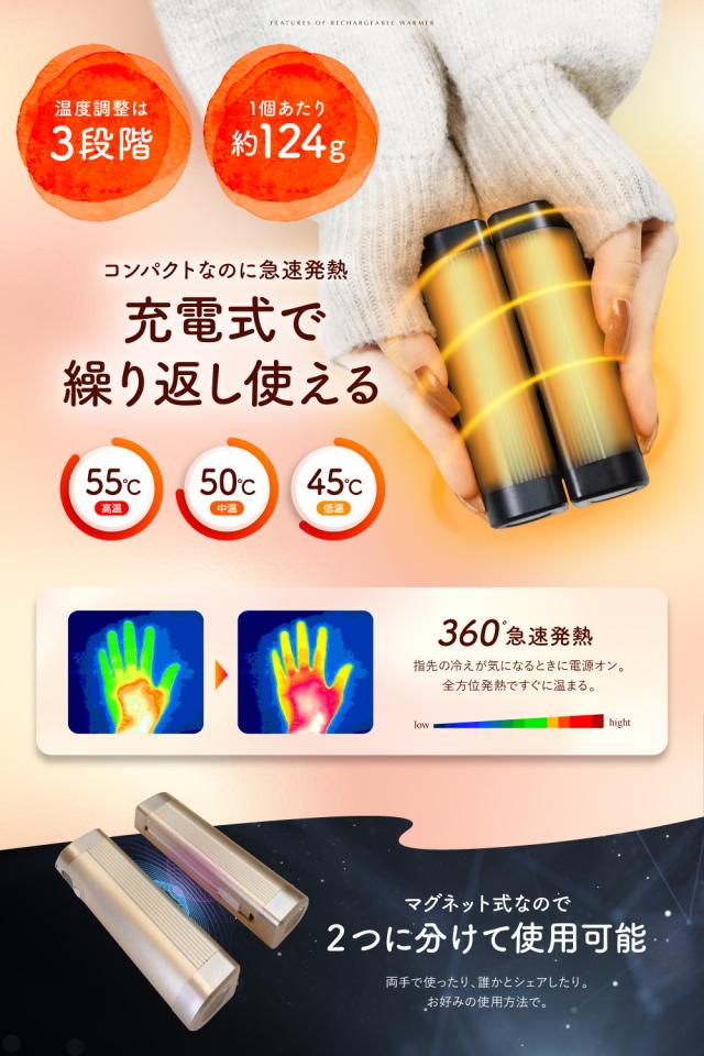 約3秒で発熱し、360度温まるので冷えた指先もすぐに温まります。