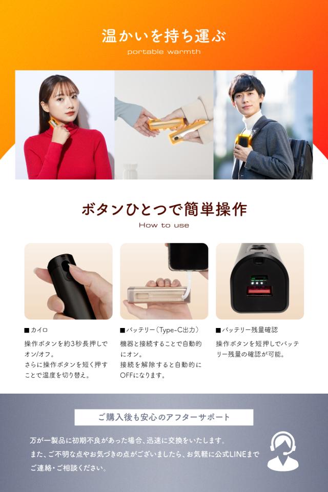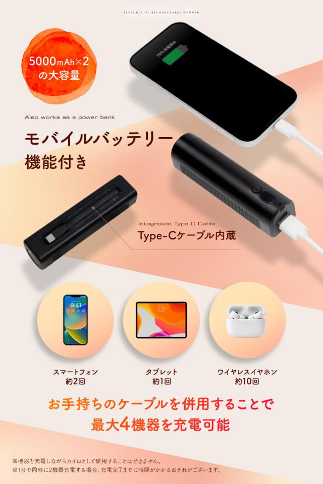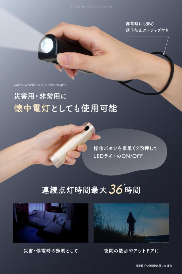 カイロ・モバイルバッテリー・懐中電灯機能付きで1台3役の充電式カイロ。
