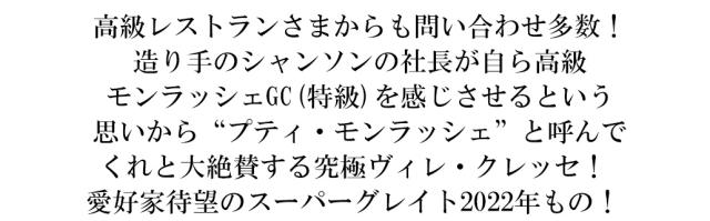 高級レストランさまからも問い合わせ多数! 造り手のシャンソンの社長が自ら高級 モンラッシェGC(特級)を感じさせるという 思いから“プティ・モンラッシェ”と呼んで くれと大絶賛する究極ヴィレ・クレッセ! 愛好家待望のスーパーグレイト2022年もの!