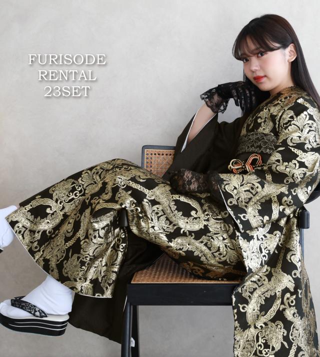 新品・最大20日間レンタル 振袖 レンタル 成人式 黒 ブラック Black 金刺繍 ゴールド刺繍 半身フルセットレンタル23点フルセット 無地 シンプル モノトーン モード 流行り 「黒地にゴールドの刺繍」 結婚式 ブラック かっこいい モノトーン レトロ