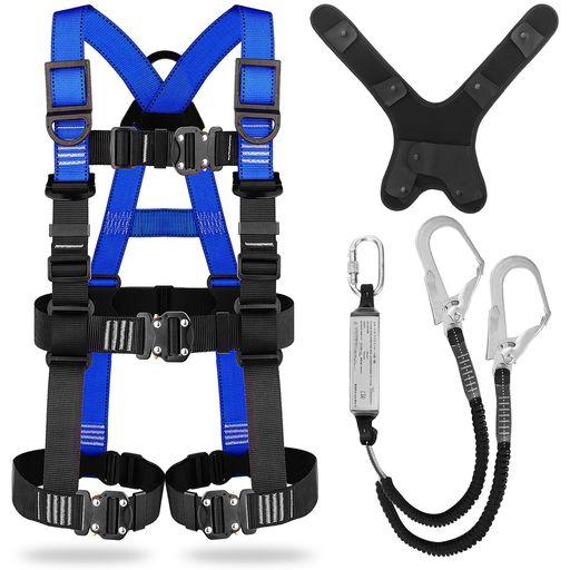 [TT TRSMIMA] フルハーネス安全帯 新規格 セット - ハーネス安全帯 ワンタッチ バックル 脱着簡単 二丁掛け ランヤード付き フルハーネスセット フリーサイズ 高所作業用 墜落制止用 青色