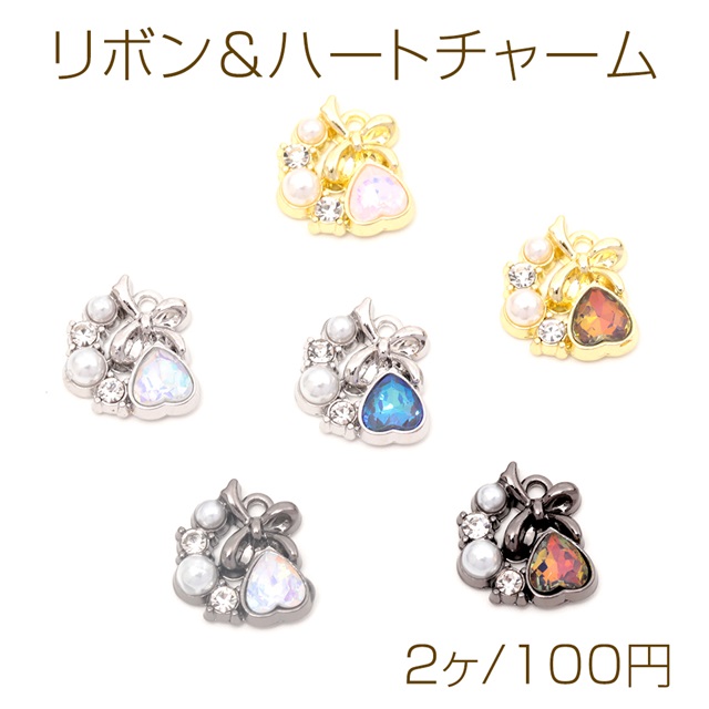 リボン&ハートチャーム ガラスストーン付き パール装飾 リボンチャーム ハートチャーム 全12色 約14×15mm (2ヶ)