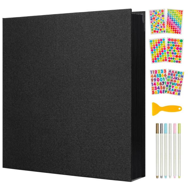 【商品仕様】アルバムサイズ:27*28*3CM 黒台紙サイズ:23*27CM(20枚/40ページ)梱包内容:写真アルバム×1冊+カラーペン×6本+デコシート×6枚+スクレーパー×1個