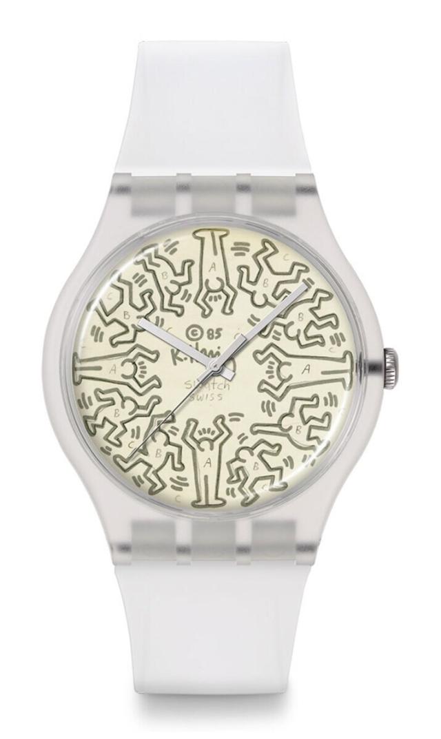 このタイムピースのマットライトベージュの文字盤には、アーティスト、キース・ヘリングのグレーのドローイング、サイン、著作権マーク、そして彼流にアレンジしたSwatchのロゴが描かれています。