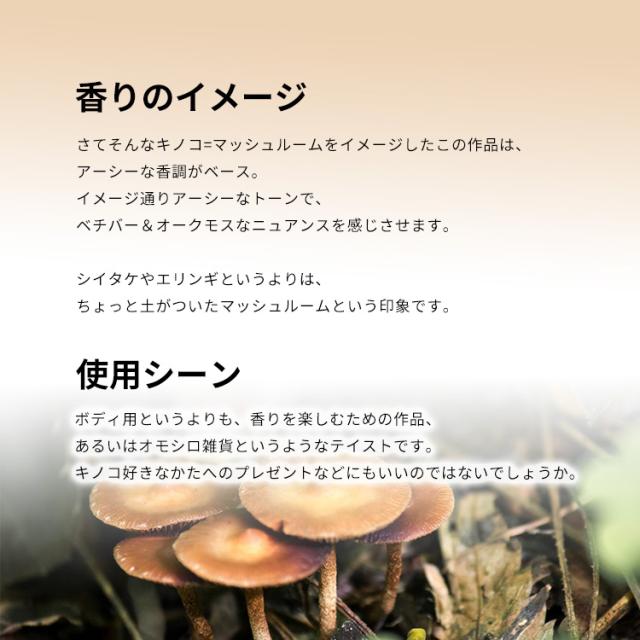 シイタケやエリンギというよりは、ちょっと土がついたマッシュルームという印象です。ボディ用というよりも、香りを楽しむための作品、あるいはオモシロ雑貨というようなテイストです。
