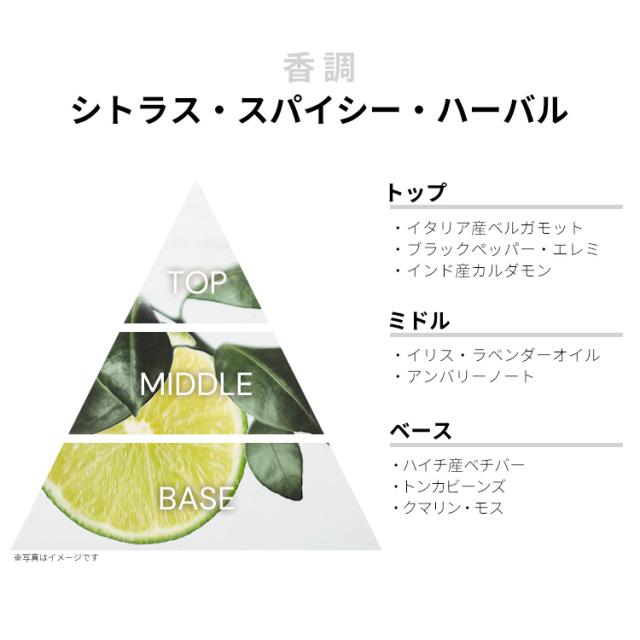 イタリア産ベルガモット、ブラックペッパー、エレミ、インド産カルダモンなどが、エナジャイジングなシトラス・スパイシーを香り立たせるトップから、