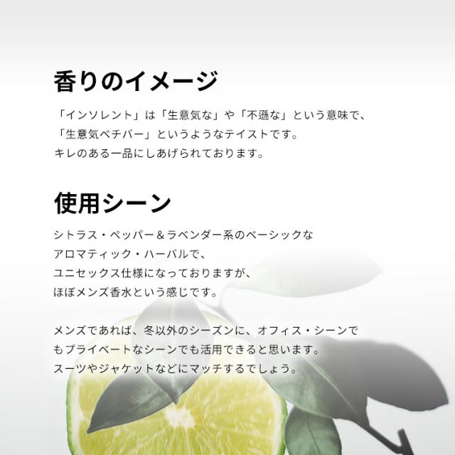 「インソレント」は「生意気な」や「不遜な」という意味で、「生意気ベチバー」というようなテイストです。香りはシトラス・スパイシー・ハーバルの香調がベース。キレのある一品にしあげられております。