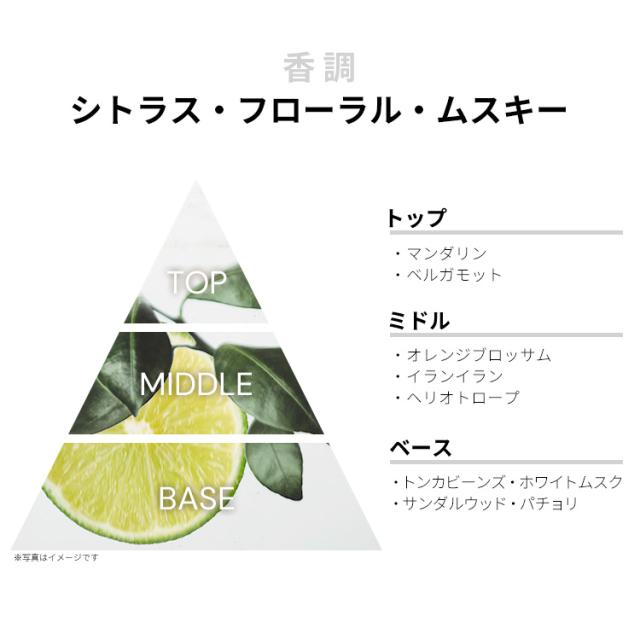 マンダリンやベルガモットなどが、あかぬけたシトラス・フレッシュを香り立たせるトップから、