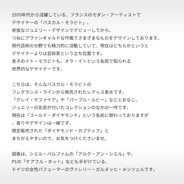 「グレイ・サファイア」や「パープル・ルビー」などとおなじ、ジュエリーの名前が付いたコレクションのなかの一作です。現在は「ゴールド・ダイヤモンド」という名前に替わっておりますが、香りやデザインは一緒です。