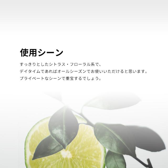すっきりとしたシトラス・フローラル系で、デイタイムであればオールシーズンでお使いいただけると思います。プライベートなシーンで重宝するでしょう。