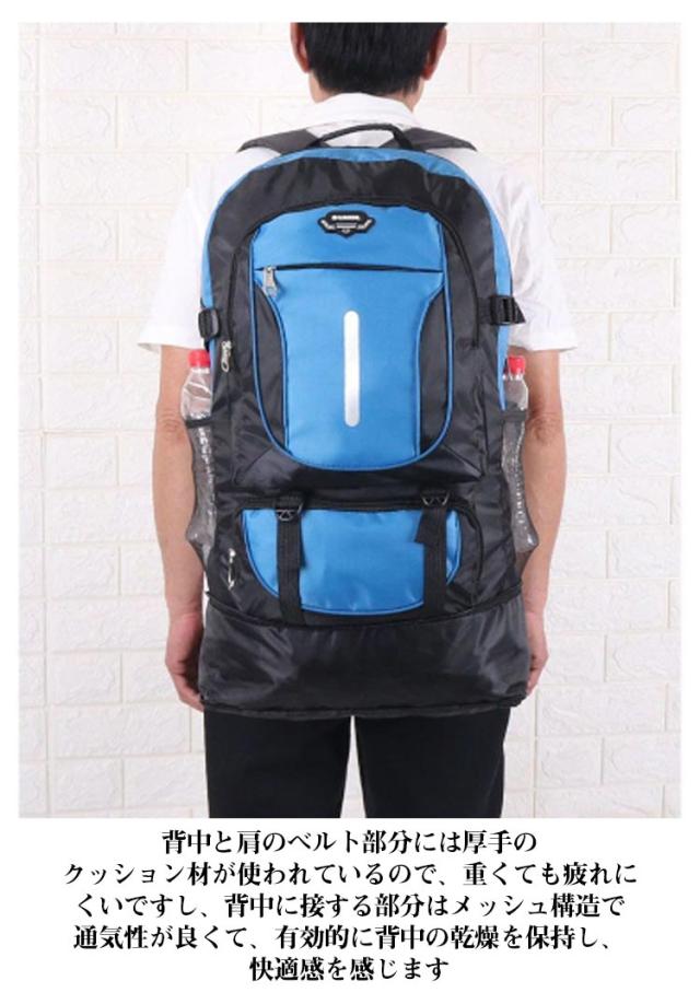 | 登山リュックサック 防災リュック!キャンプ、旅行、ハイキング、バックパッキングなど、タフなシーンに適したリュックです。 撥水のあるナイロン素材を採用するので、雨でも安心使用できます。 ポケットも多くストックホルダーやドリンクホルダーもあり機能的にあなたをサポート。タウンからアウトドアまで幅広くお使い頂けます。 背中と肩のベルト部分には厚手のクッション材が使われているので、重くても疲れにくいですし、背中に接する部分はメッシュ構造で通気性が良くて、有効的に背中の乾燥を保持し、快適感を感じます | |