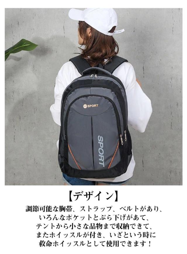 | 【軽量&耐荷重抜群】容量が勿論、耐荷重性も抜群です。アウトドアを楽しめるリュックサックです。 ? 【素材】引き裂き防止と撥水のあるナイロン素材を採用するので、雨でも安心使用できます。引き裂き防止機能があって、野外でもリュックが擦りむけられることが心配無用です。リュックが長持ちできます。 ? 【デザイン】調節可能な胸帯、ストラップ、ベルトがあり、いろんなポケットとぶら下げがあて、テントから小さな品物まで収納できて、またホイッスルが付き、いざという時に救命ホイッスルとして使用できます! ? 【快適&通気】背中と肩のベルト部分には厚手のクッション材が使われているので、重くても疲れにくいですし、背中に接する部分はメッシュ構造で通気性が良くて、有効的に背中の乾燥を保持し、快適感を感じます。 | |