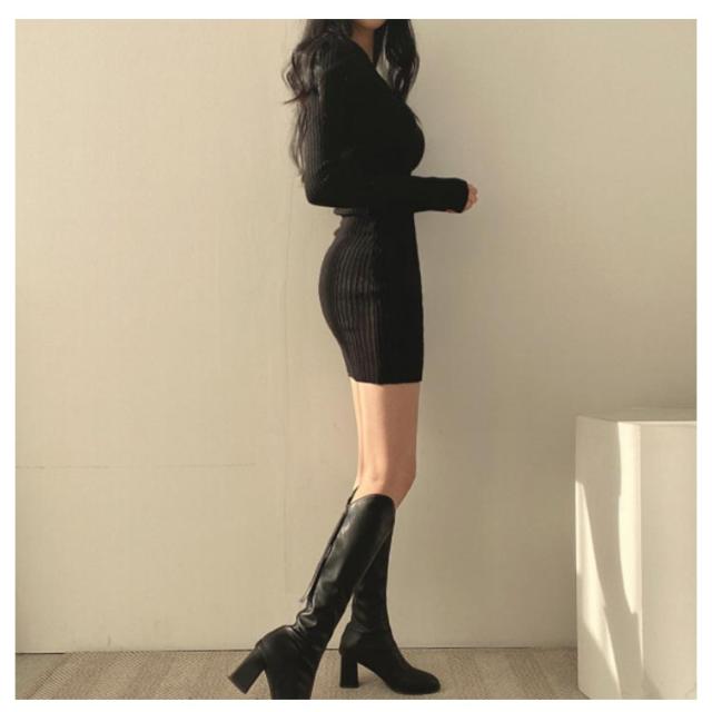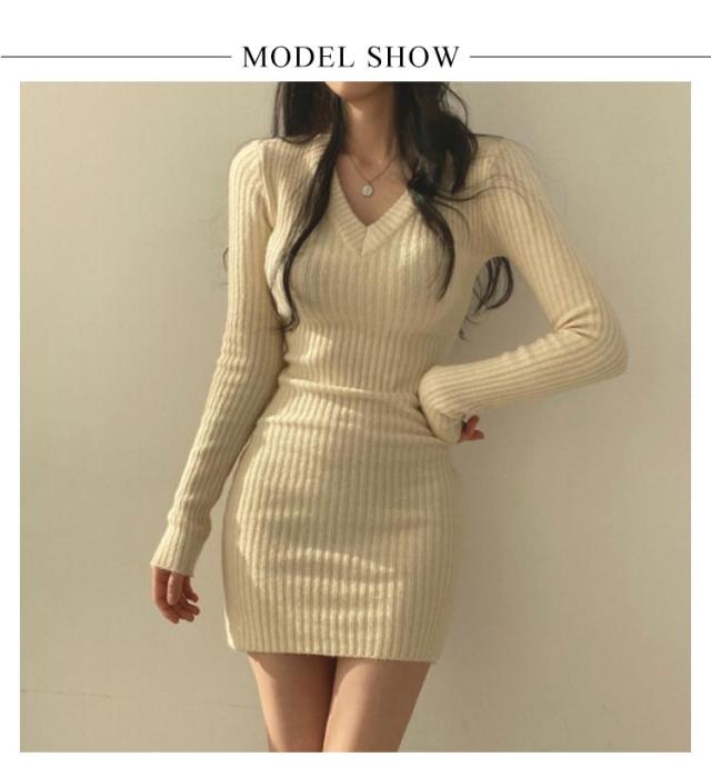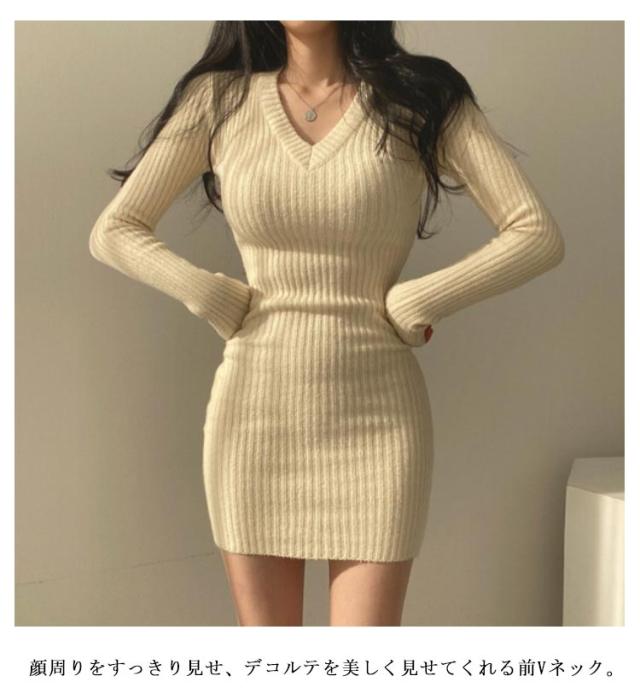 タイトワンピース ミニ丈 ニットワンピース Vネック 韓国風 ストレッチ ニットタイトワンピース レディース 長袖 ワンピース ニットワンピース 黒 伸縮性 秋冬 きれいめ ニットタイトワンピース 膝上丈 おしゃれ 可愛い タイト 重ね着 二次会 結婚式 OL オフィス