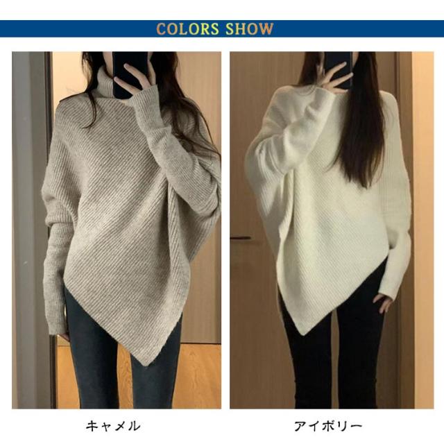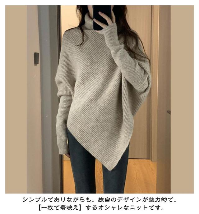 | 【アシメトリー】【4color】 個性的な秋冬の装いを楽しむためのおしゃれなハイネックリブニット。 シンプルでありながらも、独自のデザインが魅力的で、【一枚で着映え】するオシャレなニットです。 ゆったりとしたシルエットに特徴的なハイネックデザインが、首元を優しく包み込んでくれます。 | |