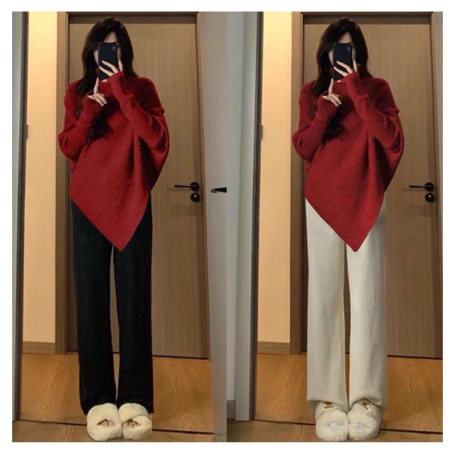 ニット ブラック 長袖 リブニット トップス タートルネック 斜め 黒 アシメトリー レッド アイボリー 赤 細見え レディース 個性的 おしゃれ ゆったり 体型カバー ハイネック ニットトップス セーター 秋冬